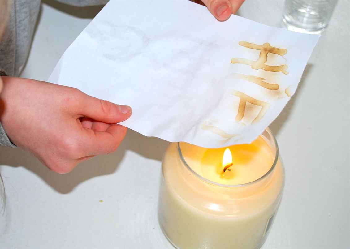 - С помощью свечи: Держите бумагу на расстоянии от пламени, чтобы избежать возгорания. Нагревание приведет к появлению текста.