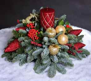 - Композиции на стол. Похожи на венки, но могут иметь разнообразные формы, а составляющие опять же могут поразить воображение. Основу обычно составляют корзины или красивые вазы с живыми и искусственными цветами, которые сочетают с палочками, еловыми ветками, лентами, ягодами, яблоками, апельсинами, шишками, елочными игрушками.