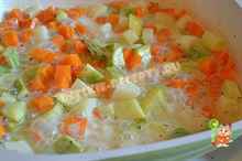 - Порежьте одинаковыми кусочками морковку, кабачок и картошку;