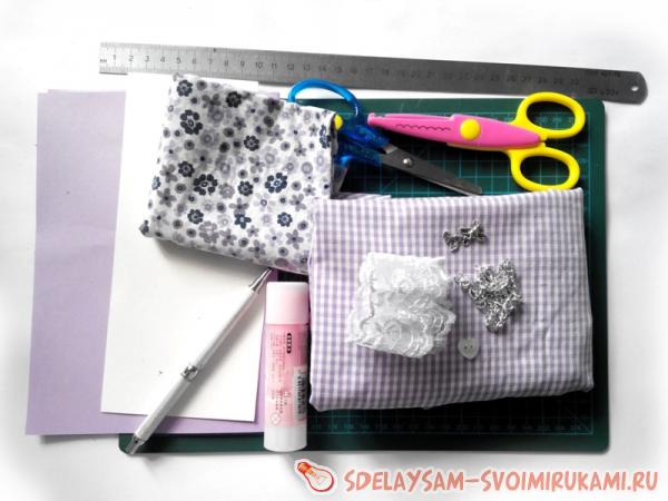 Чтобы сделать текстильную обложку на паспорт, понадобится картон плотностью 200г/м2, скрап-бумага, офисная бумага фиолетового цвета, хлопковая ткань в клеточку и в цветочек, кружево, украшения, клей ПВА, клей-карандаш, прозрачный полимерный клей, ножницы с фигурными и прямыми лезвиями, инструмент для биговки, линейка.