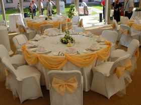 Ткань для украшения должна совпадать по цветовой гамме с остальным оформлением. Чаще всего стол драпируется несколькими видами ткани: основная скатерть, юбка, закрывающая ноги молодых (чаще делается из пышной легкой ткани для придания объема и торжественности), декоративная ткань с цветовым акцентами, которая закрепляется различными способами вокруг стола.