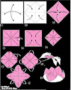 | Лилия из бумаги | Средняя | Шаг 1: Сложить квадратный лист пополам, затем развернуть. Шаг 2: Загнуть все четыре угла к центру. Шаг 3: Перевернуть и повторить шаг 2. Шаг 4: Поднять и сложить каждый из четырех «лепестков». Шаг 5: Сформировать лепестки лилии. |