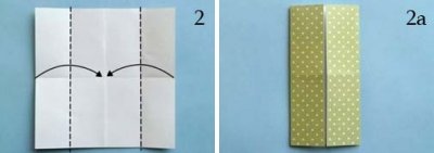 Квадрат цветной бумаги сложите по горизонтали, затем по вертикали. В этом случае лучше использовать тонкую бумагу, чтоб было проще её сложить.