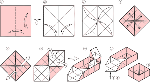 | Коробочка из бумаги | Средняя | Шаг 1: Сложить квадратный лист пополам, затем развернуть. Шаг 2: Загнуть все четыре угла к центру. Шаг 3: Перевернуть и повторить шаг 2. Шаг 4: Загнуть боковые стороны к центру. Шаг 5: Сформировать дно и крышку коробочки, используя клапаны. |