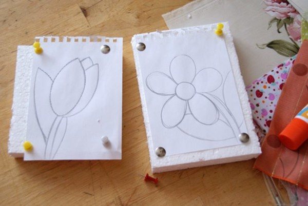 При отсутствии принтера рисунок можно нарисовать самостоятельно от руки или по клеточкам. Рисунок нужно перенести на пенопласт при помощи копирки или нарисовать его маркером. Картина должна иметь рамку, поэтому работа начинается именно с этого элемента.