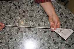 Угол газетки заворачиваем под аналогичным наклоном и хорошо прижимаем, далее рукой поворачиваем палочку и поэтапно закручиваем трубочку, придерживая для удобства газету. На угол газетной полосы наносим клей и заворачиваем ее до конца, затем даем клею схватиться и вынимаем палочку. Если начинать закручивать со стороны буковок, то трубочка получится светлой.