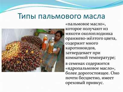 | Регуляция | Существуют стандарты качества и безопасности для пальмового масла, используемого в пищевой промышленности. | Не всегда эффективный контроль за соблюдением стандартов и наличием вредных примесей. |