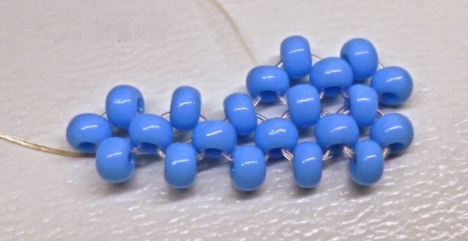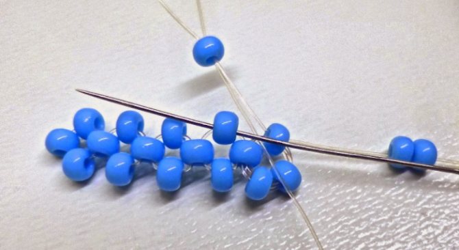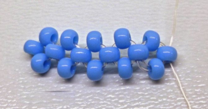 - Если бисер крупный, проводить иголку желательно через две бусинки, чтобы они ложились ровнее. Далее набираем по бусинке и повторяем все этапы, плотно приплетая одну бисеринку к другой.