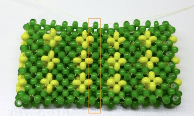 - Когда нить заканчивается, закрепляем ее, проводя несколько раз через бисеринку в готовом полотне, и отрезаем.