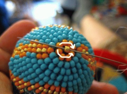 Нить протягивайте через нижний ряд. С каждым последующим увеличивайте количество бусин пропорционально окружности. По достижению экватора, напротив, сужайтесь. Осторожно закрепите край нити внутри конечной бусины.