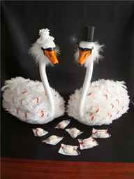 Лебеди из конфет: Лебеди из конфет — это романтичный и необычный подарок, который можно сделать для особого случая. Для создания таких лебедей вам понадобятся: конфеты, проволока, фольга и клей. Сначала сформируйте тело лебедя из конфет, скрепляя их проволокой. Затем создайте голову и шею, используя фольгу для придания формы. Завершите оформление, добавив декоративные элементы, такие как цветы или перья, чтобы сделать лебедей более изящными.