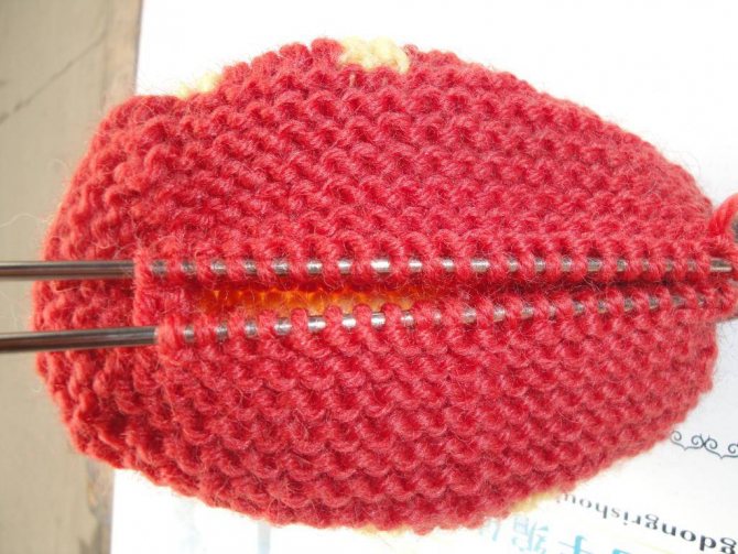 Набираем спицами 26 п., это у нас будет подошва. Затем – 2 р. л. гл.. 3 р.: 1 л. п., следующую п. провязываем 2 раза (сначала за переднюю стенку лиц., затем – за заднюю лиц. – добавили п.), 9 л. п., пров. п. два раза, 2 л. п., пров. п. 2 р., 9 л. п., пров. п. 2 р., 1 л. п. = 30 п.. 4, 6, 8 рр. – и. п.. 5 р.: 1 л. п., пров. п. 2 р., 11 л. п., провязываем петельку 2 р., 2 л. п., провязываем п. 2 р., 11 л. п., пр. пет. 2 р., 1 л. п. = 34 п.. 7 р.: 1 л. п., пр. п. 2 р., 13 л. п., пр. п. 2 р., 2 л. п., пр. п. 2 р., 13 л. п., пр. п. 2 р., 1 л. п. = 38 п..