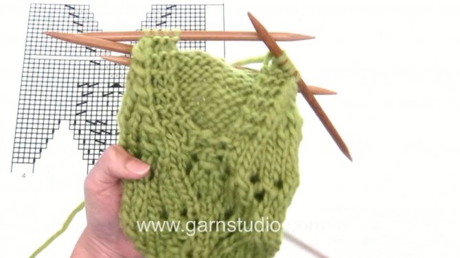 - После снимается одна петелька (п), далее необходимо сделать накид (нк), после идет одна лицевая петля (лп), нк, 2 лп, нк, лп, нк, 6 лп, нк, лп, нк. Последняя провязывается изнаночной.