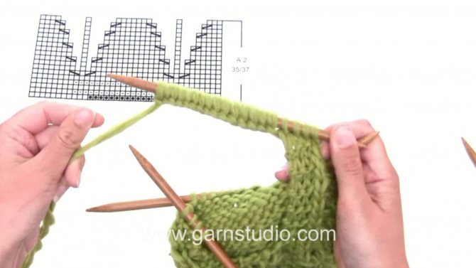 - 23-й ряд: 8 ЛП и еще две провязываются одновременно. 24-й ряд выполняется по аналогии с 22-м. До 36-го ряда повторяется вязка по схеме 23 и 24 рядов.