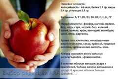 Калорийность яблок тоже радует. В ста граммах свежего плода всего 47 ккал. Хотя здесь почти нет жиров, но благодаря углеводам, после съедания продукта чувство сытости остается продолжительное время. Из-за этого часто их употребляют во время диеты.