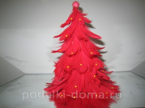 Расстояние между ярусами перьев зависят от размера конуса-основы и самих перьев. Чем ближе к вершине елки, тем меньшего размера необходимо брать перья. фото 6 и 7