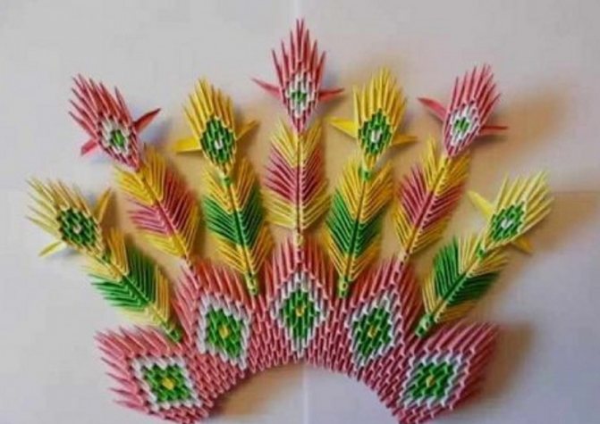 Сборка хвоста павлина и соединение всех деталей воедино представлены в видеоуроке по модульному оригами павлина.