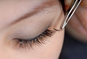 Далее пинцетом нужно вытащить из коробки один пучок и, обмакнув его корень в клей, сразу приклеить на кожу века по краю роста ресниц. Важно, чтобы глаз, на который наклеиваются ресницы, был закрытым.