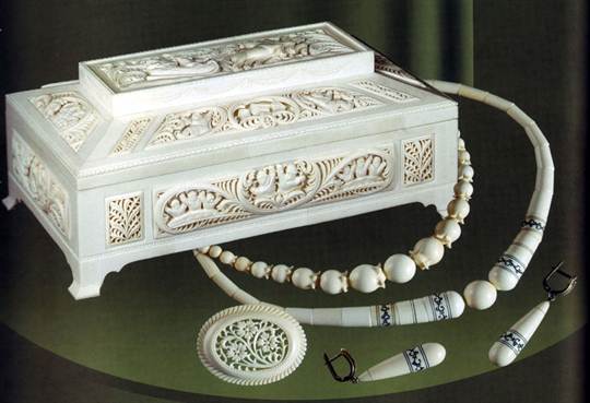 Работа с костью прошла долгий исторический путь — именно резьба по кости стала одним из первых человеческих занятий. Со временем благодаря народному ремеслу люди стали получать не только инструменты: иглы, булавки, пуговицы, рукоятки орудия, наконечники, — изделия стали выполнять еще и декоративную функцию. Так, костяные предметы обихода стали украшать замысловатыми узорами и вырезами. Кроме того, появились украшения в виде нашейных ожерелий, браслетов, серег и колец, заколок.