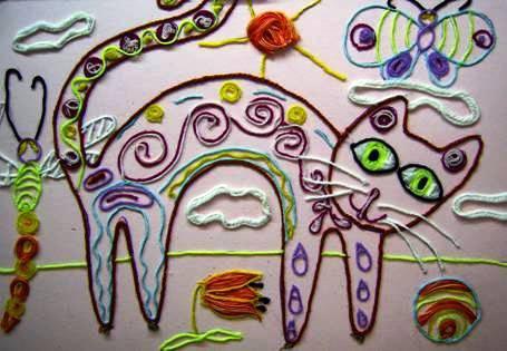 Разнообразить технику рисования нитью можно используя пряжу различной текстуры. К примеру, тонкая и ровная нить типа ирис или мулине даст рисунку нежные и изящные линии. Пряжа из шерсти или акрила придаст объемность и яркость. Только использовать их одновременно не получится из-за разной толщины. Придется делать рисунок в несколько этапов, обязательно дожидаясь, чтобы подсох предыдущий слой. Рисование шерстяными нитками более удобно для маленьких детей или пожилых людей, чьи пальцы имеют не слишком хорошую чувствительность. Однако не стоит пренебрегать и более тонкой работой. Всегда стоит совершенствоваться в рисовании с помощью ниток и красок.
