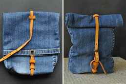 Рюкзак, сшитый из штанины, можно с помощью шнурочка из кожи превращать в маленькую сумочку-клатч.