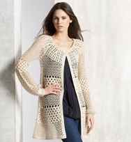 Другой модный вариант – кружевной. Цвета, в основном, пастельные, а также черный, белый и редко красный. Очень красив и очень актуален кружевной кардиган на пляже, надевают его на купальник. При выборе одежды и создавая особо женственный стиль вместе с кружевным кардиганом нужно не забыть главное — акцент должен быть, в любом случае, на нем. Соперничества кружевной кардиган не потерпит! Поэтому здесь фоном надеваются различные топы, выделяя красоту кружева. Обувь только на каблуке, таком же изящном и тонком, как и кружево.