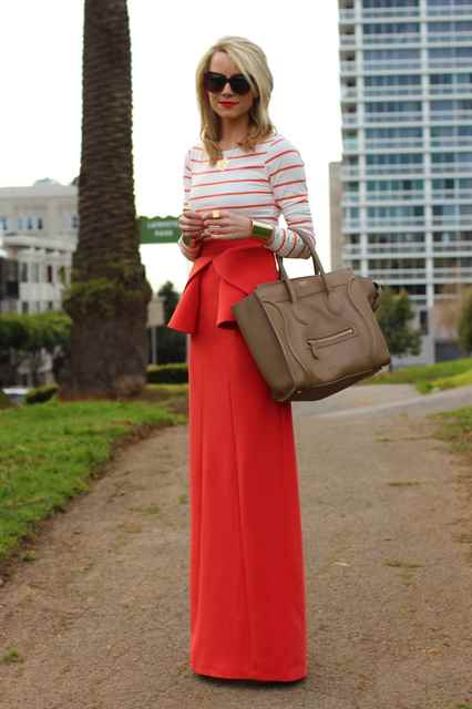 Юбка-макси поможет вам выделиться из толпы и выглядеть обворожительно. Помните о том, что если вы надеваете пышный верх, то низ, соответственно, должен быть облегающий и наоборот. Хорошо будет смотреться, если длинную розово-коралловую юбку дополнить заправленной джинсовой рубашкой или белой майкой и сверху накинуть курточку из денима.