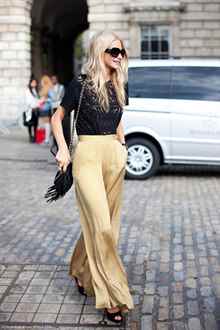 Ну и, конечно же, широкие брюки помогут создать нарядный, торжественный облик. Для особого случая подойдут брюки из ткани с блеском или из многослойного шифона, цвета бронзы или золота. Также не забывайте про волшебную силу монохромных нарядов – стоит облачиться, к примеру, во все белое или красное, как вы уже притягиваете к себе взгляды окружающих.