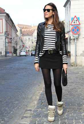 С юбкой черного цвета будет сочетаться белая блузка или топ, а вот кроссовки подойдут тоже белого цвета. Не надо забывать про аксессуары и маленькую сумочку на плече.