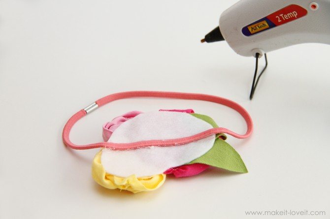 Пока клей высыхает, следует измерить окружность головы и отрезать получившуюся длину от резинки или ленты. Концы основы сшить и пришить к ней уже сделанный цветок.