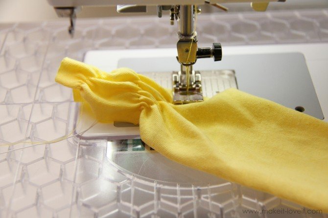 - Натянуть ткань на всю резинку (должна получиться гармошка) и отстрочить второй край. Резинка для косынки готова.