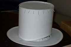 Следующий этап подразумевает создание полей. В зависимости от их ширины, надо сделать один широкий круг, потом приложить цилиндр, обвести его периметр, так получится круг с вырезом внутри. Полученный круг надо приклеить на те надрезы, которые были сделаны ранее. Вот и готов цилиндр, такая схема считается более простой, но если нужен верх, можно просто приклеить круг картона сверху, а линии соединения можно украсить лентой или другими элементами.