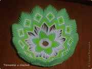 Угловые модули цвета 2 соединяем с модулями цвета 1. На этом этапе конфетница начинает становиться объемной, немного изгибается и приобретает вид чашечки.