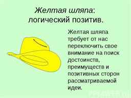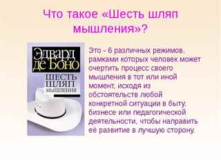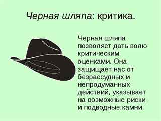 - Меняя одну шляпу на другую, совершается молниеносная смена мышления. Это позволяет вызвать переключение движения мысли, не обидев при этом человека. Не происходит нападение на сообщаемые мысли, а просто звучит просьба изменить их.