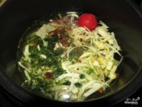 - Кожицу с помидора снимите, бросьте к остальным продуктам, а также зелень, лавровый лист, соль, специи. Залейте все двумя литрами кипяченой воды. Выставьте режим приготовления «суп» на 30 минут. Крышка должна быть обязательно.