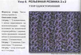 Как видно, резинка является односторонней, ее можно вязать по круговой, применяя произвольное сочетание лицев. и изнаноч. петель.