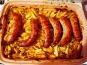 8. Когда все будет готово, оставляем картошку со шпикачками в духовке еще на три минутки для подхода.