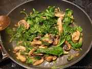 После этого добавьте шпинат на сковороду. Он быстро уменьшится в объеме, поэтому не переживайте, если вам кажется, что его много. Обжаривайте шпинат с чесноком, помешивая, около 3-5 минут, пока он не станет мягким. В конце приготовления посолите и поперчите по вкусу. Если хотите добавить немного свежести, сбрызните блюдо лимонным соком.
