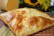 Слоеное тесто раскатывают максимально тонко, а на него выкладывают всю начинку. Берут вторую половинку теста и накрывают, защипывая края. Обязательно с помощью вилки проделывают отверстия, чтобы мог выходить лишний пар. Готовый конверт смазывают обычным яйцом либо смешивают желток с оливковым маслом.