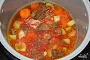 - Затем в емкость положить томатную пасту и влить кипяток. Выставить режим «Тушение» с временным интервалом в один час.