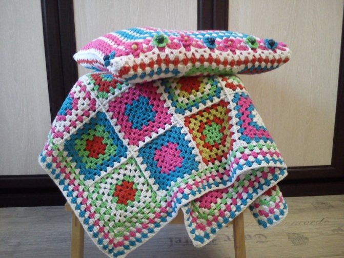 К покрывалу как раз можно связать и квадратные сидушки на стулья.