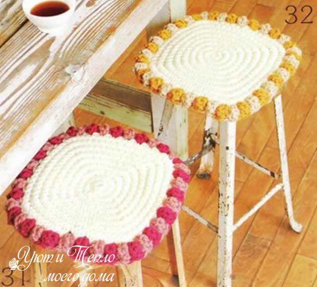 Если накидка на табурет вяжется с целью утепления мебели или повышения уровня комфорта, нужно украсить готовое изделие. Оригинальный декор освежит интерьер, поможет правильно расставить акценты. Популярностью пользуются следующие варианты оформления: