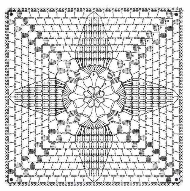 Такой рисунок, наверно, многие уже видели – у нас есть идея вязаного покрывала такими большими квадратами со схемой, подробным описанием и видео мастер классом.