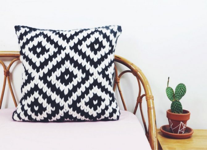Как вязать этот узор, мы уже разбирали в статье о круглых подушках, там и видео есть.