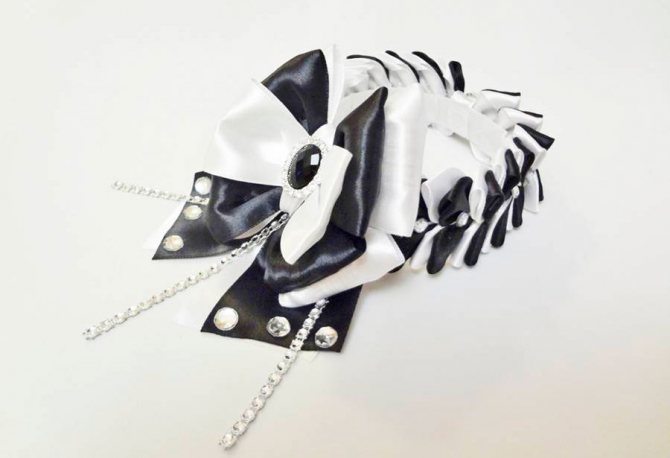 - Соберите бант: возьмите заготовку со стразовыми цепочками и прикрепите к ней белый бант их 4х петель. Сверху прикрепите чёрный бант и маленький белый бантик. Обвяжите по центру белой ленточкой и приклейте чёрный кристалл.