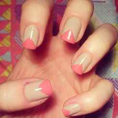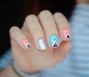 Но все же, на некоторых формах ногтей треугольники могут выглядеть неуместно, но если подобрать правильный дизайн, и такие геометрические формы будут украшать маникюр. На коротких ногтях треугольники могут делаться с помощью тонких кистей или дотса. После нанесения треугольника, его площадь заполняется выбранным цветом, также можно использовать тонкую кисть или удобную кисть лака.