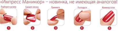 Для лучшего результата ногти нужно обезжирить специальной салфеткой или жидкостью, перед этим отшлифовать их. Далее нужно взять пластину и удалить с нее защитную пленку с обратной стороны, лучше начинать с мизинцев. Как только пленка убирается, пластинку нужно хорошо прижать к ногтю, разровнять ее, и немного подержать палец на ней. В принципе, проделав это 10 раз, маникюр будет готов. Снимается такой маникюр быстро и легко, достаточно просто поддеть пластину и снять ее плавным движением.