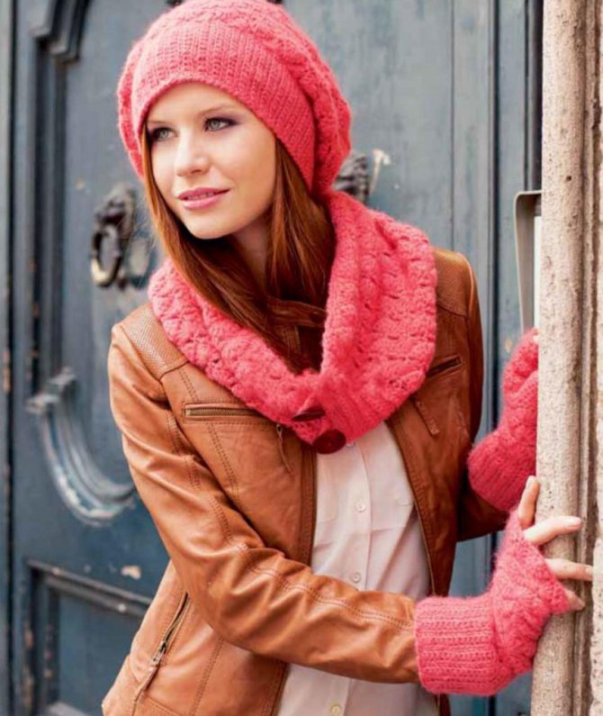 Если к шарфу добавить вязанные шапочку или митенки, то подбирать цвет комплекта к верхней одежде не придется. При всем этом маленькие дополнения к аксессуару сделают образ женственным и неповторимым.