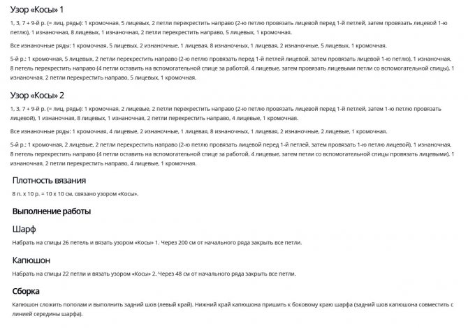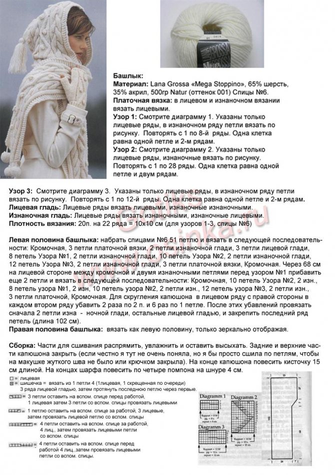 Интересно, что шарф-капюшон на спицах вяжут какой угодно длины: достаточной, чтобы завязать концы на затылке или же большой, когда концы шарфа ниспадают, достигая нижнего края полы пальто. Сам капюшон по желанию располагают по центру шарфа (в этом случае концы одинаковой длины) или же ассиметрично, т.е. ближе к одному из концов, когда вокруг шеи обматывают лишь более длинную часть шарфа.