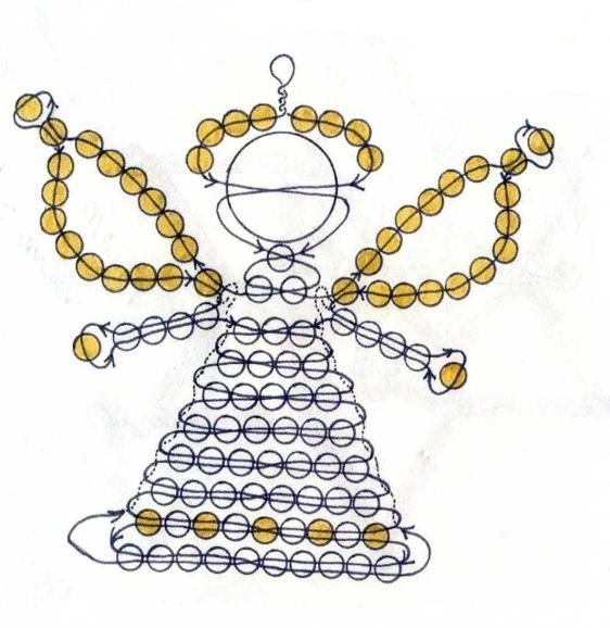 Собирайте поделку по приведенной схеме. Если вы будете использовать золотой бисер и стеклярус, а для головы и ручек — жемчужные бусинки,то ангелок у вас получится просто классным!